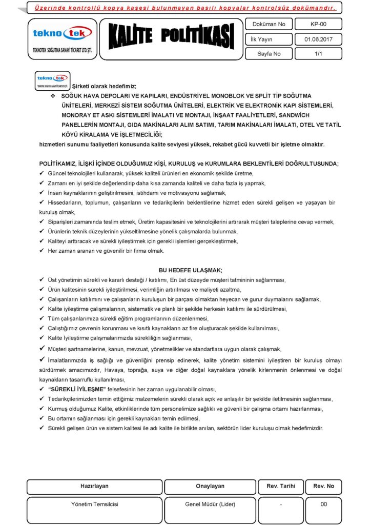 Our goal will be having refrigerators, unit coolers and cold storage panels for each size to be accepted by us first. We will try to become the first name that comes to mind about cold room. Our primary goal is to take pleasure from our costumers due to working with TEKNOTEK from the first contact to the delivery of the material or work.
